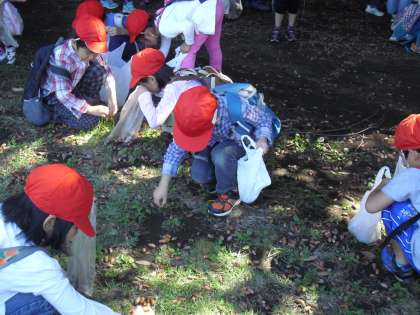 どんぐりの木の周辺は、まるでどんぐりのじゅうたんのようでした。子どもたちは、きれいなどんぐりが地面にたくさん落ちているのを見つけて、嬉しそうに拾いました。