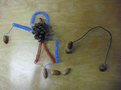 学校に戻ってから、どんぐりのおもちゃ作りをしました。拾ってきた立派などんぐりを眺めながら、おもちゃ作りにどのどんぐりを使おうか考え、やじろべえ、ぶらぶら人形、ブローチなどを作りました。