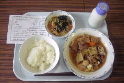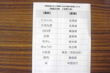 今日は『都民の日』ということで、私たちが住む東京都や世田谷区についてもっとよく知ってもらうため、給食にも世田谷区でつくられた野菜を取り入れています。それは、すき焼き煮に入っている“小松菜”です。身近でつくられた食べ物は、新鮮でおいしく、栄養満点です。よく味わってください。この世田谷区にもたくさん畑があり、小松菜の他にもキャベツや大根、ブルーベリーやりんごなど、色々なものがつくられています。知っていましたか。