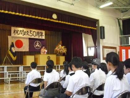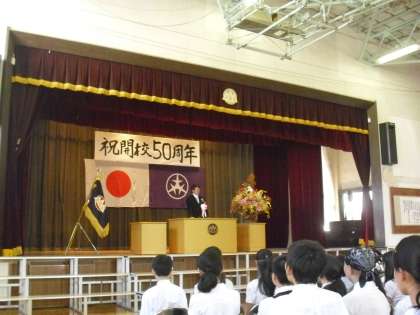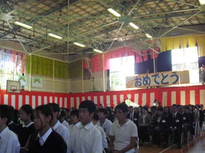 およそ200人のお客様を迎え、いよいよ式典が始まりました。学校の代表として参加している6年生の顔が引き締まっています。厳かな中にも、あたたかい雰囲気で式は進んでいきました。会場上部を飾っている、6年生のしぼり染めが鮮やかです。