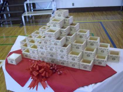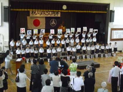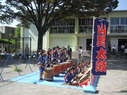 式典と祝賀会の間は、山野の山の前で山野太鼓の子どもたちの演奏が行われました。素晴らしい天気のもと、太鼓の音が校庭に響きました。その間に体育館は大急ぎで模様替え。祝賀会開演の前には、山野合唱団の天使の歌声の発表です。途中で一人一人の子どもから、コスモスの花がお客様にプレゼントされるなど、すてきな演出がきらりと光りました。