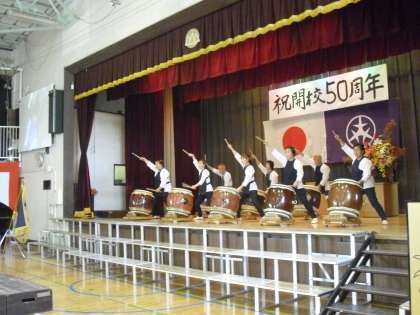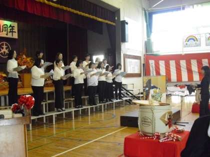 昔懐かしい方々、世田谷区の先生方、地域の方々など、あちらこちらで笑顔の花が咲いています。そして、後半はPTAコーラスの皆さんの心のこもった歌声。和響太鼓の皆さんの迫力ある太鼓の演奏とステージはとっても華やかです。盛り上がっています。胸がいっぱいです。