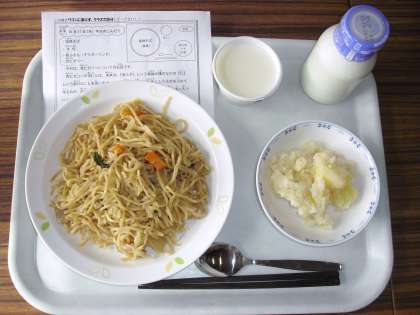 今日は、塩焼きそば、牛乳、粉ふきいも(チリガーリック)、杏仁ゼリーです。