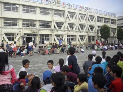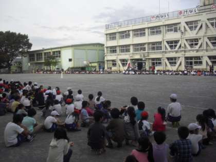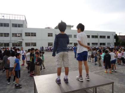 今日の集会は、「めざせ!てっぺん」ゲームです。クイズをフェスタカラーで分かれたたてわりの班で競いました。クイズに正解すると1つ前に進めます。チームで協力して正解を重ねてどんどん前に進めて、てっぺんをめざします。学校に関わるクイズでしたが、皆よく知っていて正解の連続でした。例えば、「溝口校長先生は、第12代校長先生である。○か×か。」こんな問題もほとんどのチームが正解していました。さすが。50周年を機会に学校のことをたくさん学んだのですね。