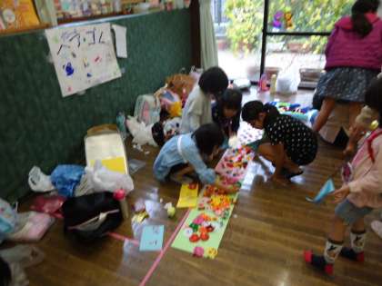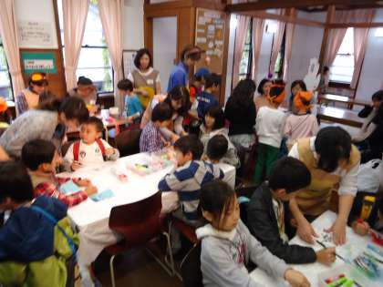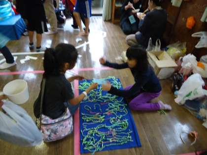 PTAの皆さんもきらきらバッジのコーナーや、ジュース、ドーナツ、フランクフルトなどたくさんの場所で頑張っています。子どもたちは、今日のために児童館での活動で手作りの品物を用意し、それぞれお店を出していました。かわいいアクセサリーのお店がたくさん出ていました。