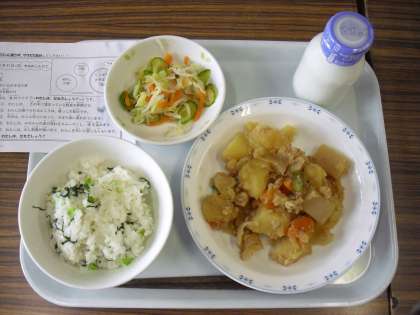 今日は、菜めし、牛乳、じゃがいものそぼろ煮、野菜の甘酢づけです。