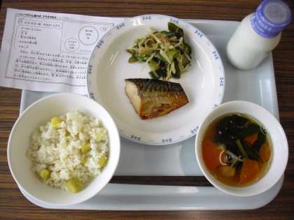 今日は、さつまいもごはん、牛乳、魚の七味焼き、わかめの酢の物、すまし汁です。