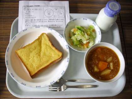今日は、フレンチトースト、牛乳、ビーンズシチュー、コーンフレンチサラダです。
