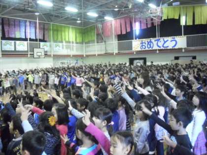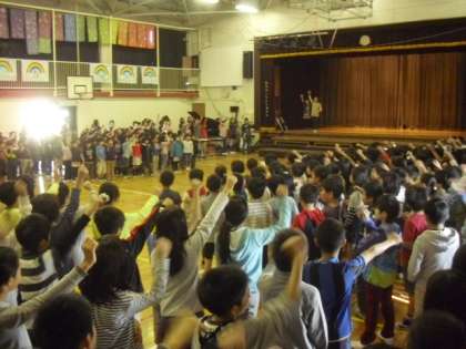今日の音楽集会では、フェスタのオープニングの歌、『仲間をしんじて』を歌いました。途中にカウントダウンのかけ声が入ります。元気な声でカウントダウンできていました。