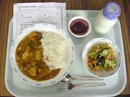 今日は、ジャーマンカレーライス、牛乳、糸寒天と野菜の和え物、ぶどうゼリーです。