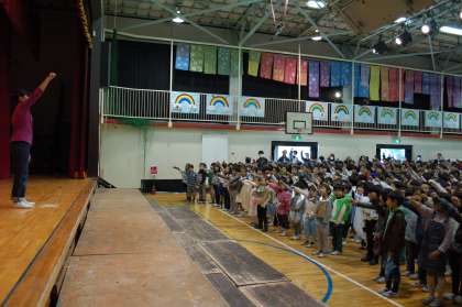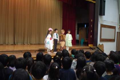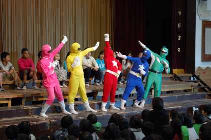 オープニングは、かわいい1年生児童代表の言葉と、恒例のフェスタレンジャーによる鑑賞時の注意です。フェスタレンジャーは代表委員の子どもたちが自分たちで作り上げた一つの演目です。会場が盛り上がりました。そして、オリジナルのフェスタオープニング曲「仲間をしんじて」を全員で歌いあげていよいよ始まりです!