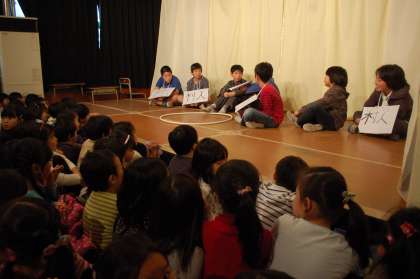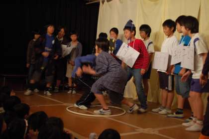 午後からは、雨で校庭の演目がなくなり、ランチルームはとんでもない人数が集まり大にぎわい。ぎゅうぎゅう詰めの状態で始まりました。題からは、ドタバタ劇かなと思っていましたが、いやいやなかなかよく考えられた劇でした。2つのお話とも、子どもたちのオリジナル。演出も自らというのには、驚きました。そういう目で見ると、子どもたちって本当にすごい!
