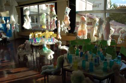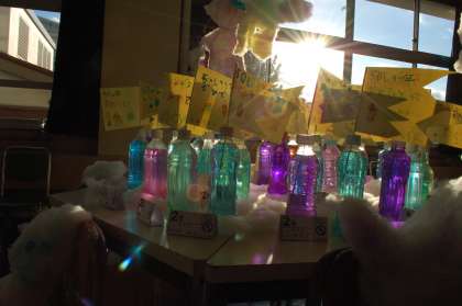多目的室には、2年生の作品が飾られています。「コンニチハ、ふわふわちゃん」はふわふわっとなんだか本当に癒されるような作品です。「わくわくボトル」はさしこんでくる光でキラキラ輝いていました。