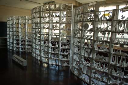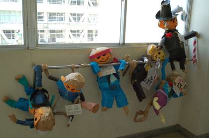 学習室には6年生の「ホワイトルーム」が飾られています。光と影の美しさをテーマとしているこの空間は、近未来をほうふつさせます。なお、学校中に出現している「わくわくサル」も6年生が50周年のお祝いのために作った作品です。