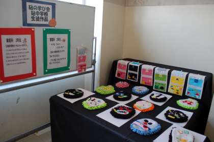 なお、家庭科室に行く途中の廊下には、砧の学び舎砧中学校の家庭科作品も展示してあります。さすが中学生です!子どもたちも足を止めて見入っていました。
