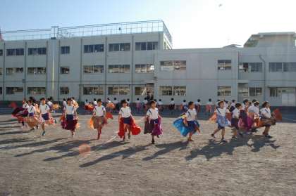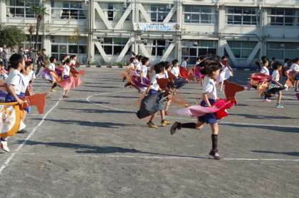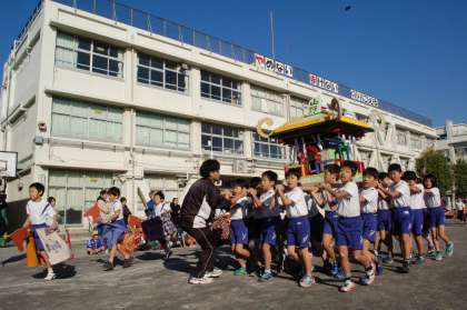 校庭では、3年生の荒馬が行われました。長時間はね続けるこの演技は、見た目以上に疲れます。子どもたちは本当によくがんばっていました。担当した前薗先生は山野の卒業生で、ご自身もやまのフェスタ経験者です。こんな伝統もあるんですね。50周年記念集会で作られた山野みこしも登場し盛り上がっていました。