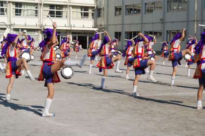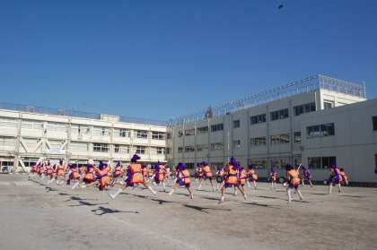 6年生伝統のエイサーです。今年は何とPTAから50年記念として、エイサーの衣装一式80人分を寄贈していただきました。ありがとうございます。そのお披露目公演です。子どもたちの気合いのいれ具合も違います。どうです、この腰の低さ、跳躍の高さ。躍動感あふれていました。