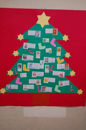 図書室にも、季節感あふれる飾り付けが。このツリーよく見るとお勧めの本がつり下げられています。もうすぐ12月です。