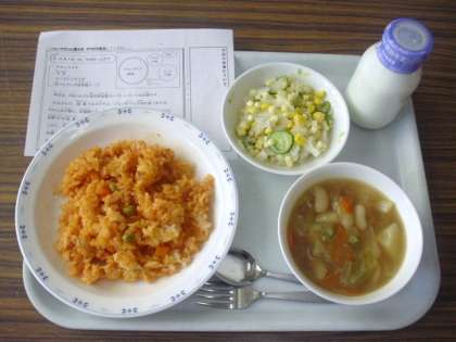 今日は、チキンライス、牛乳、チーズ入りサラダ、白いんげん豆の田舎風スープです。