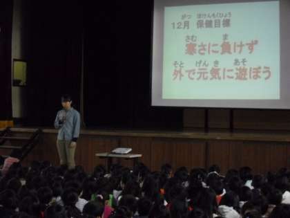 養護教諭から「寒さに負けず元気に遊ぼう」について話がありました。しっかり食べて、外で遊び、睡眠をしっかり取り、風邪に負けない体をつくりましょう。
