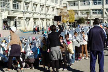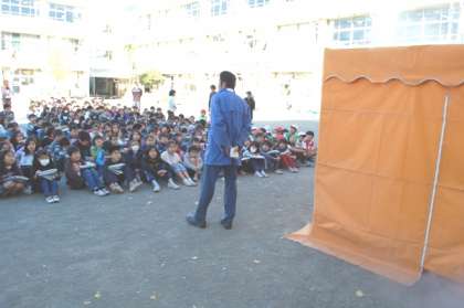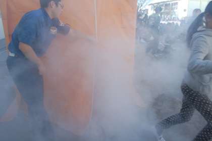 引き続いて、4,5年生は、煙中体験をしました。テントの中は真っ白で、煙の怖さを学びました。