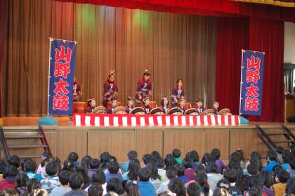 毎年3学期の始業式は、山野太鼓の演奏で幕が開きます。体育館に響きわたる太鼓の音に、新年の思いも新たになります。