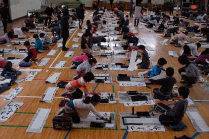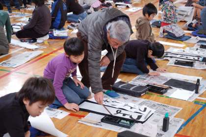 山野小では、3年生以上は体育館で書初め大会をします。学年全員が一堂に会して、心を集中して自分の作品に向き合います。厳かな時間です。
