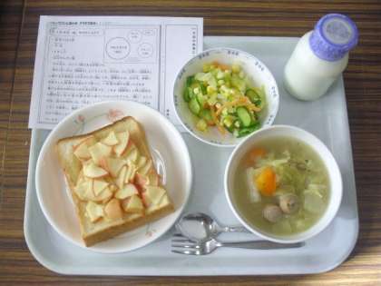 今日は、アップルトースト、牛乳、チーズ入りフレンチサラダ、ポトフです。
