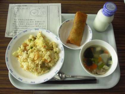 今日は、エビピラフ、牛乳、春巻き、かぶのスープです。
