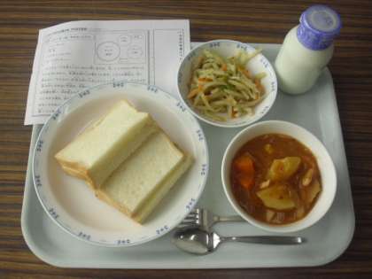 今日は、ハニーサンド、牛乳、シャキシャキソテー、ビーンズシチューです。