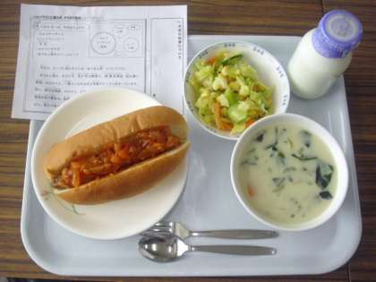 今日は、セルフチリサンド、牛乳、キャベツサラダ、ほうれん草のクリームスープです。