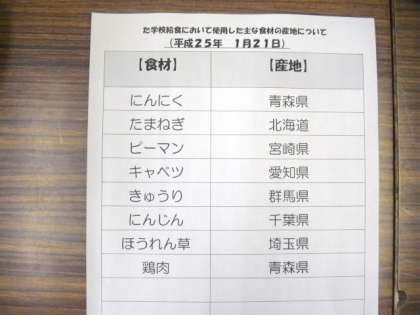 メモは、スープに使われているほうれん草についてです。ほうれん草は、まさに今、冬が旬の野菜で、緑黄色野菜(色の濃い野菜)の中でもトップクラスといえるほどたくさんの栄養をもっています。特に、鉄分や葉酸、カロテン、ビタミンCなどが多いので、血をつくって貧血を防ぐ働きや風邪などの病気に負けない体をつくる働きがあります。ぜひ残さず食べて、丈夫な体をつくりましょう。