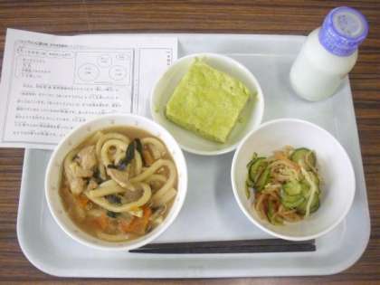 今日は、あっさりうどん、牛乳、中華風ごまだれかけ、八丈蒸しパンです。