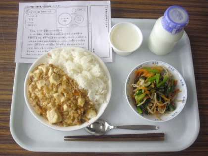 今日は、マーボー丼、牛乳、ナムル、杏仁ゼリーです。