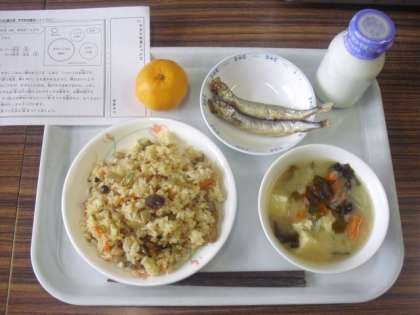 今日は、きのこごはん、牛乳、ししゃも、みそ汁、ぽんかんです。