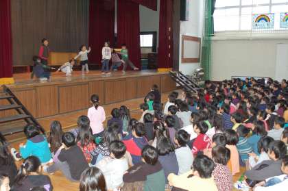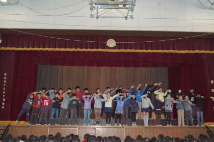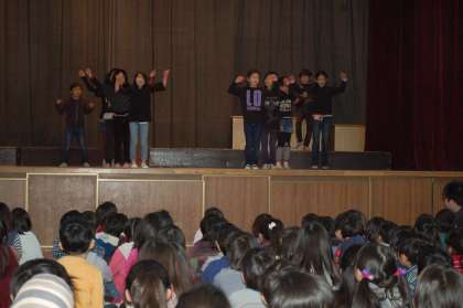 今日の児童集会は、発表集会です。予選(オーディション)を通過した3グループが発表してくれました。最初は、1年生によるおやじギャグ集団です。続けざまにおやじギャグ(例 校長先生 絶好調 とか)連発で会場は大笑いでした。次は3年生による踊りです。女子だけでなく男子も混ざり息の合ったところを見せてくれました。最後は5年生がみんなで協力して作ったクラスの歌を発表しました。力を合わせて何かをするって、思い出に残ることでしょう!