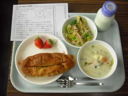 今日は、ガーリックフランス、牛乳、ハムと大根のサラダ、森のチャウダー、いちごです。