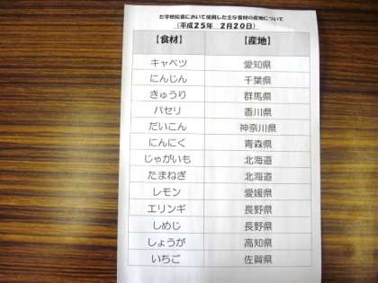 メモは、いちごについてです。日本でいちごが本格的につくられるようになったのは、今から約100年前の明治時代です。最初は「福羽」(ふくば)という品種がほとんどでした。しかし、その後100年の間、甘さやすっぱさ、色、粒の大きさ、硬さなどを考えて品種改良が行われ、今では、栃木県の『とちおとめ』福岡県の『あまおう』、佐賀県の『さがほのか』、静岡県の『紅ほっぺ』などなど、全国各地で色々な品種がつくられるようになりました。今日みなさんが食べるのは、2001年に開発された佐賀県の『さがほのか』です。上の部分が丸く、下にかけて鋭く細くなっている形と甘みが強いのが特徴です。
