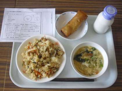 今日は、五目ずし、牛乳、和風じゃが春巻き、かき玉汁です。