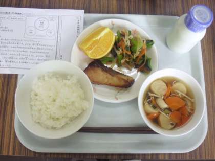 今日は、ごはん、牛乳、ぶりの照り焼き、糸寒天と野菜の和え物、おふ汁、ネーブルです。