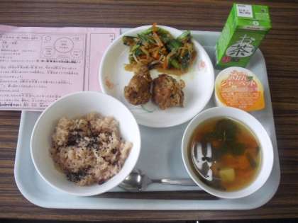 今日は、赤飯、お茶、鶏肉のからあげ、こんにゃくサラダ、すまし汁、デザートです。