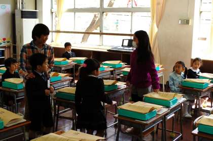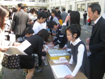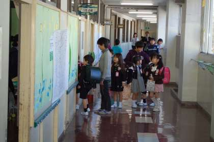 始業式後、今度は入学式です。ピカピカの1年生とご家族が、続々と受付に来ました。出迎えるのは6年生。受付で、1年生を引き取りお教室までちゃんと連れて行ってくれます。教室では、教室係りの6年生が座席を教えてくれたり、ロッカーに荷物を入れてくれたり大活躍。6年生、気合十分!