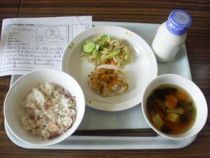 今日は、桜の花ごはん、牛乳、甘辛つくね、野菜のごま酢かけ、豆腐と小松菜のすまし汁です。