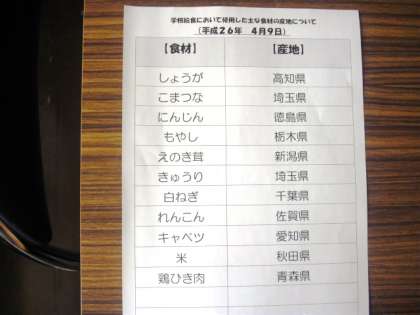 平成26年度の給食が始まりました。新しい教室できちんと準備ができましたか。給食当番を中心にクラスで協力して準備、片づけを行いましょう。今日は、桜の塩漬けをごはんと一緒に炊き込んだ“桜の花ごはん”です。ほんのりとした塩味と桜の香りが特徴の春ならではの献立です。よく噛んで味わってみてください。