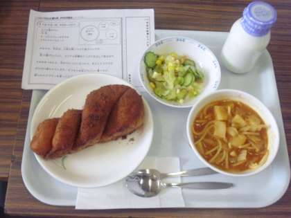 今日は、ココア揚げパン、牛乳、チーズ入りフレンチサラダ、ミネストローネです。