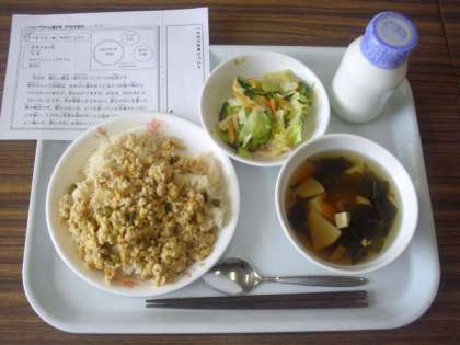 今日は、四色そぼろ丼、牛乳、みそドレッシングサラダ、若竹汁です。