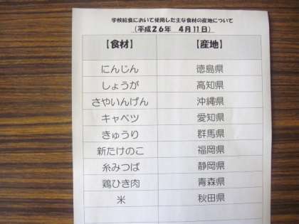 メモは、新しい献立“若竹汁”についてです。若竹汁という名前は、そこに使われている2つの食べ物からつけられていますが、何かわかりますか。それは、わかめとたけのこです。今の季節しかとれない新たけのこを使った春の献立です。新たけのこは、一年中使われている水煮のたけのことは違い、たけのこ本来の味がギュッと詰まっています。ぜひ、よく噛んで、新たけのこを味わってください。