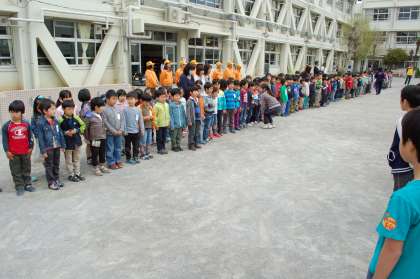今日から1年生が朝会や集会に加わってきます。その一番最初ということで、1年生と2年生〜6年生の対面式が行われました。5クラスの1年生を目の前に、2年生は先輩としてピシッとしていました。そして、6年生はさすがです。大きな声で返事をしていました。