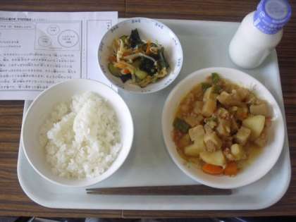 今日は、ごはん、牛乳、じゃがいものそぼろ煮、梅ドレッシングサラダです。
