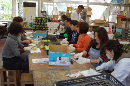 山野小では、学校運営委員会の呼びかけで保護者、地域の方々のお力を借りて、机、いすの足につけるテニスボールを作っています。(テニスボール大作戦)今日は、その1回目。教員を含め、10人以上の参加がありました。今後、年何回か実施しますので、ご協力よろしくお願いします。